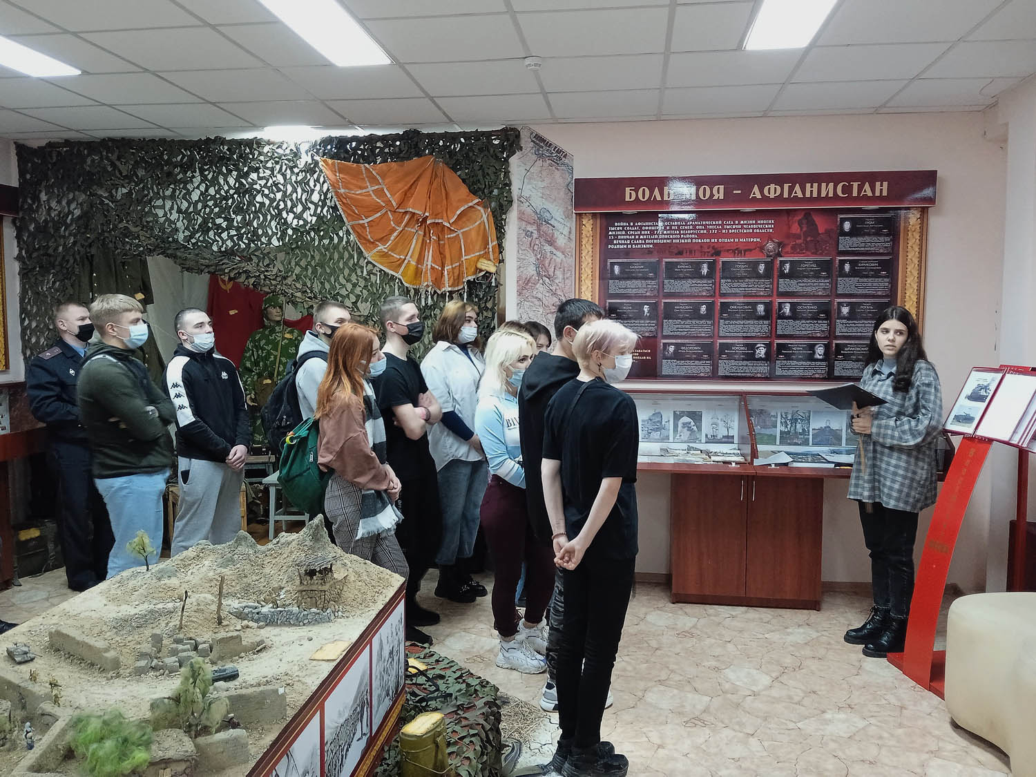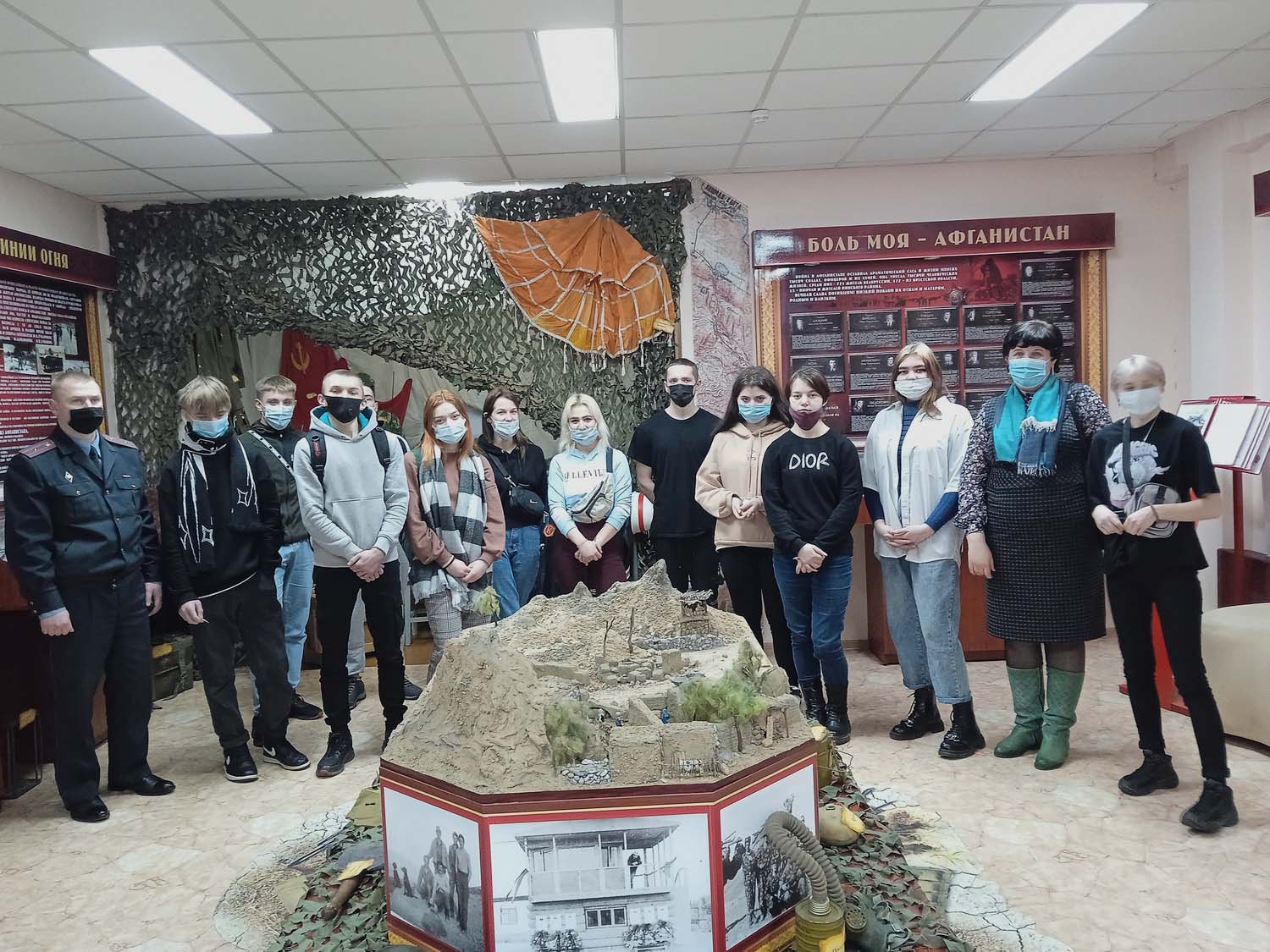 «11 февраля, в преддверии дня вывода советских войск из Афганистана, для учащихся, с которыми ведется индивидуальная профилактическая работа, организовали экскурсию в музейную комнату боевой славы воинов-интернационалистов в Афганистане, созданную на базе Пинского колледжа УО «Брестский государственный университет имени А.С.Пушкина».