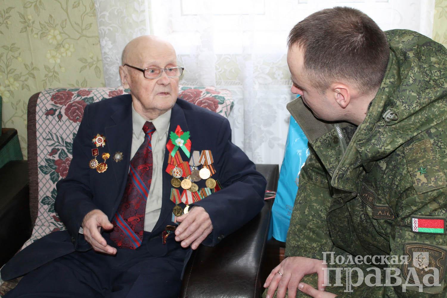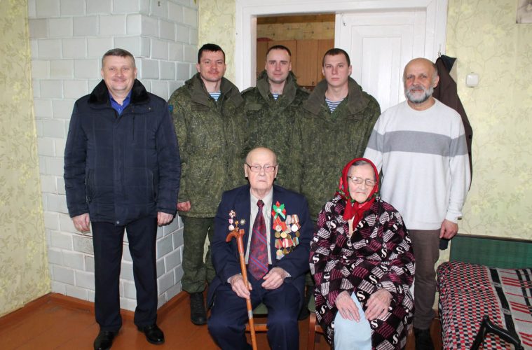 Гвардейцы 38 Брестской отдельной гвардейской десантно-штурмовой Венской Краснознаменной бригады, которые участвуют в проходящих учениях и дислоцируются в Пинском районе, в преддверии Дня защитников Отечества и Вооруженных Сил Республики Беларусь навестили ветерана Великой Отечественной войны Иосифа Григорьевича Столярчука из д. Домашицы и поздравили его с приближающимся праздником.