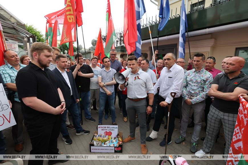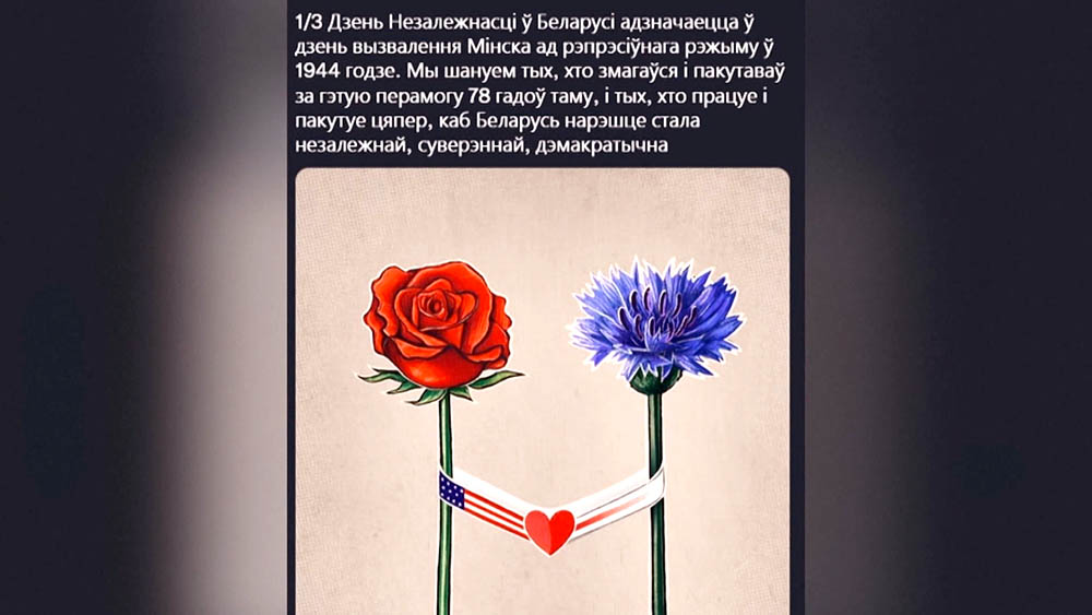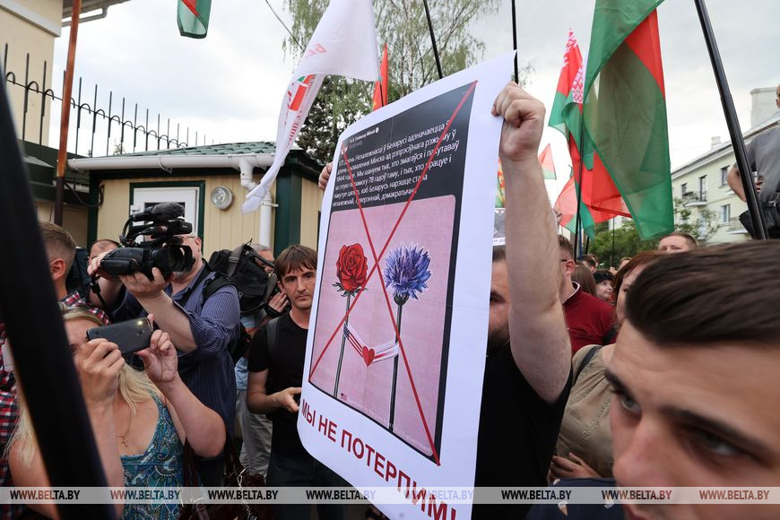 Во-первых, два цветка – это символ траура. Но провокация в том, что в день освобождения Минска от фашистов выбрана символика, которую использовали коллаборанты и пособники оккупантов. Этот совершенно недружественный жест не остался незамеченным. У посольства США сегодня собрались небезразличные белорусы, чтобы выразить протест и указать на недопустимость таких действий.