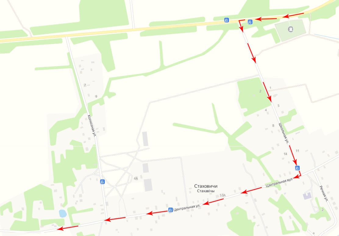 Взамен старой схемы движения: а/д Н218 (Пинск-Дубое) – ул. Колхозная – ул. Центральная – Дачи, автобус будет двигаться по новой схеме: а/д Н218 – ул. Школьная – ул. Центральная – Дачи.