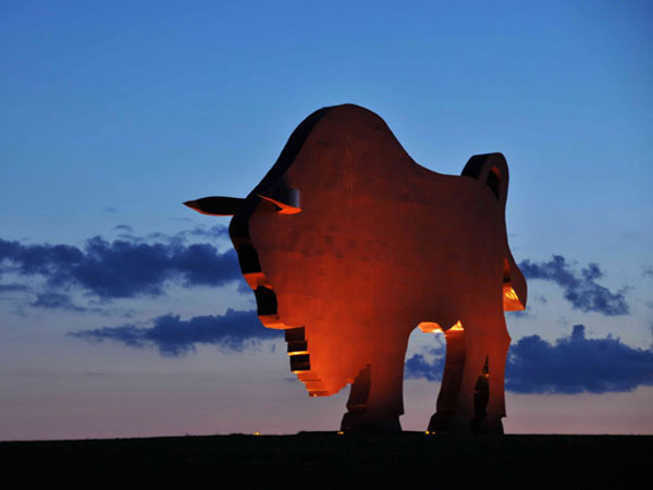 Гигантская фигура зубра на границе Брестской и Минской областей появилась в 2003 году. Металлическая скульптура практически полностью плоская, выступают только рога. Изготовили конструкцию на Пинском судостроительно-судоремонтном заводе.