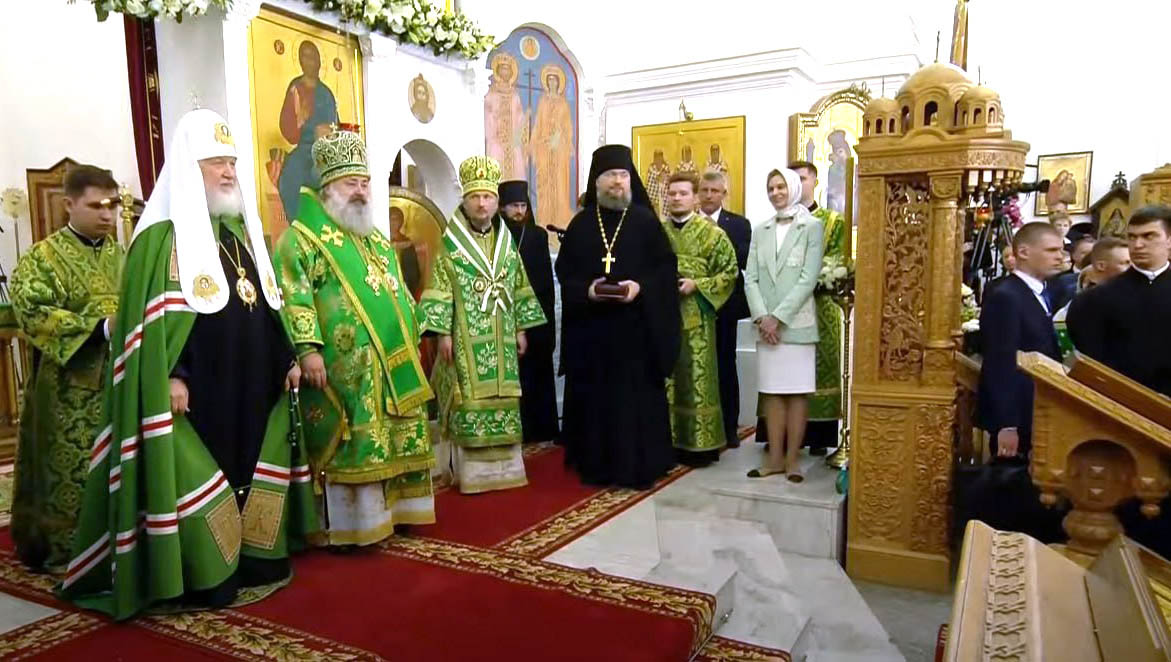 Святейший патриарх возглавил богослужение в Крестовоздвиженском храме обители, после чего вручил награды Русской Православной Церкви ряду священников и представителям власти.