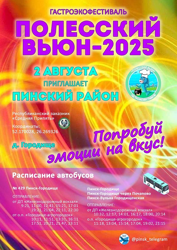 2 августа, в день проведения гастроэкофестиваля «Полесский вьюн», Пинский автобусный парк организует дополнительный маршрут № 429 Пинск-Городище.
