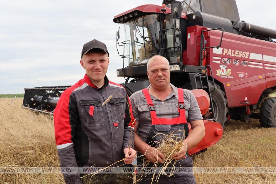 В филиале «Невель» ОАО «Пинский мясокомбинат» на уборке зерновых с огоньком трудится семейный экипаж Дубыниных – Сергея Александровича и его старшего сына Ильи. Парню 18 лет, и это его первая уборочная. Дубынин-старший больше десяти лет на комбайне. Говорит, нравится работать в сельском хозяйстве. Хоть этот сезон и сложный, дождливый, но хочется убрать побыстрее, без потерь. Если случаются поломки, то они оперативно устраняются, запчастей хватает. Тем более в технике неплохо понимает не только отец, но и сын – Илья недавно окончил автомеханический колледж по специальности «слесарь по ремонту автомобилей».