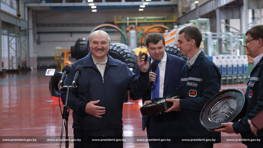 Во время посещения ОАО «Белшина» в Бобруйске Александру Лукашенко подарили новый вид продукции предприятия – комплект хоккейных шайб.